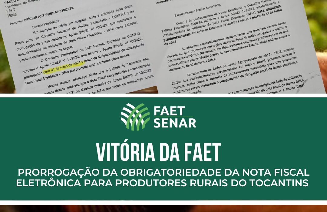 10/05/2023 FAET comemora prorrogação da obrigatoriedade da Nota Fiscal Eletrônica para pequenos produtores rurais Posted by Renata Santana