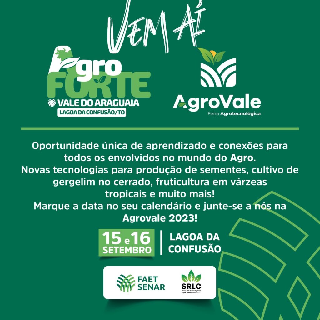 O AgroForte – Vale do Araguaia é uma das atrações da AGROVALE, a feira tecnológica de Lagoa da Confusão, idealizada pelo Sindicato Rural do município, em parceria com o sistema FAET/Senar e a empresa de consultoria em agronegócio, FARM 360, especialista em eventos no setor rural. A iniciativa conta com o apoio do Governo do Tocantins, por meio da Secretaria da Agricultura, e da Prefeitura de Lagoa da Confusão.