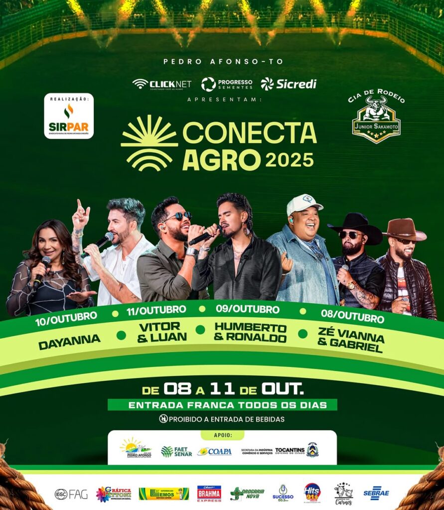 O Conecta Agro é uma realização do Sindicato Rural de Pedro Afonso e Região (SIRPAR), com apoio do Sistema FAET/SENAR/Sindicatos, Cooperativa Agroindustrial do Tocantins (COAPA), Serviço Brasileiro de Apoio às Micro e Pequenas Empresas (SEBRAE), Secretaria Estadual do Turismo, do Conselho de Desenvolvimento Econômico do Estado (CDE), Prefeitura Municipal de Pedro Afonso e Governo do Tocantins.