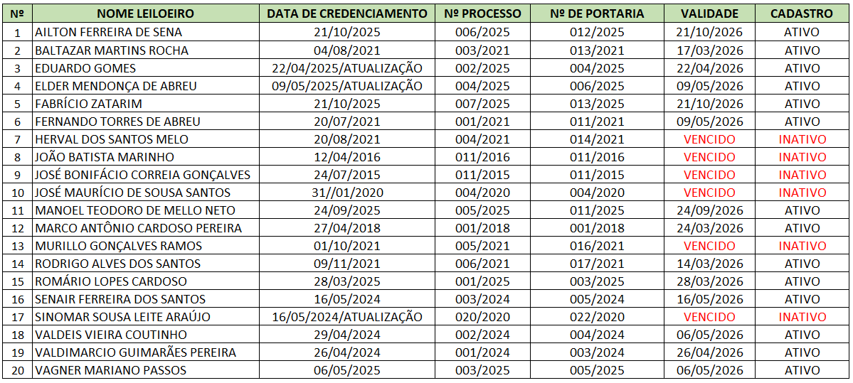 A relação dos profissionais credenciados estão disponíveis no site da Federação da Agricultura, especificados com nome, data de credenciamento, nº de credenciamento, nº do ato de constituição, validade do credenciamento e situação do cadastro.