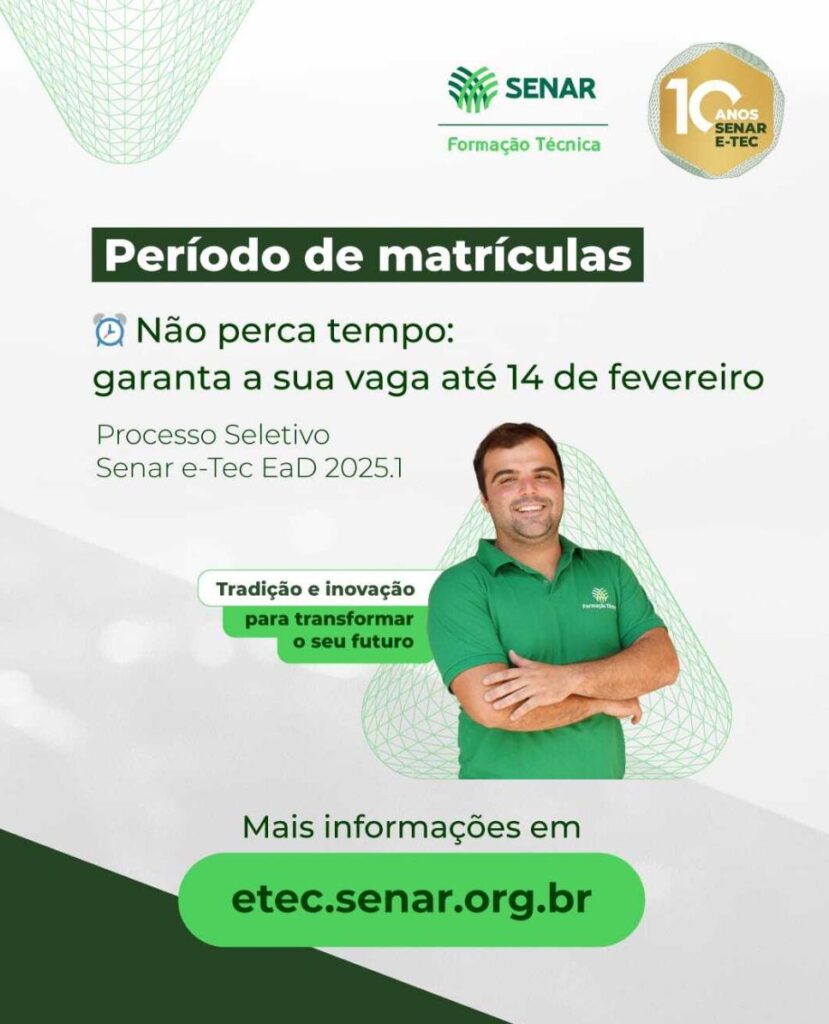 Até sexta (14), os candidatos aprovados no processo seletivo dos cursos técnicos do Serviço Nacional de Aprendizagem Rural (Senar) podem fazer a matrícula presencialmente nos polos de apoio nos estados.